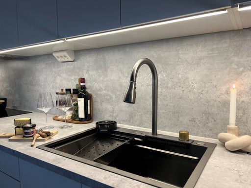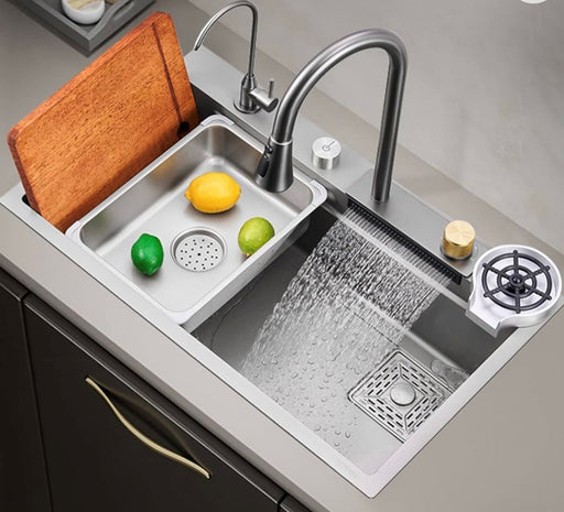 Stilren diskho i rostfritt stål med integrerade funktioner, praktisk design för en effektiv köksmiljö.Vattenfallsbänk i rostfritt stål - SvartTillv...
